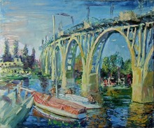 Розгляньмо детальніше окремі картини автора. «Яхта під червоним тентом», тепла пора року, ріка Дніпро - головна водна артерія України, яка є чудовим місцем для вітрильництва та екотуризму, яхтсмени, що готуються до водної подорожі, великий міст… «Сонячний настрій», раювання ясного дня, кущі, дерева вздовж Дніпра, вдалині видніється міст та будівлі одного з районів міста…
